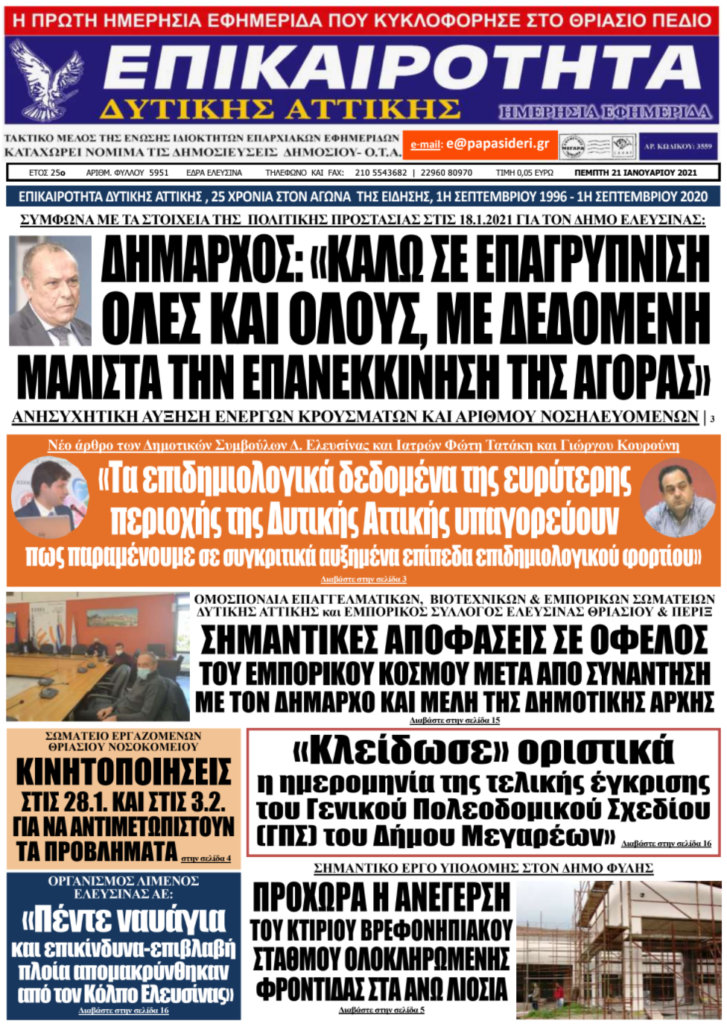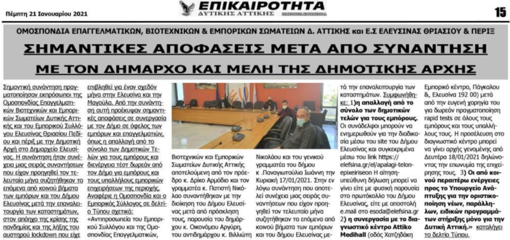 Jan212021Νέα Category: ΝέαBy admin21/01/2021Share this postShare with FacebookShare with TwitterShare with LinkedInShare with Google+ Author: admin Post navigationPreviousPrevious post:Δελτίο Τύπου: Συνάντηση με Δήμο ΕλευσίναςNextNext post:Συνάντηση με τον Αντιπεριφερειάρχη Δυτικής ΑττικήςRelated PostsΠάσχα 2025-Εορταστικό Ωράριο Καταστημάτων07/04/2025ΤΕΜΠΗ 28.02.2325/02/2025Εορταστικό Ωράριο Χριστουγέννων05/12/2024Παράταση ως 2 Σεπεμβρίου για την υποχρεωτική εγγραφή στο Iris28/08/2024Ψηφιακό χαραχτήρα αποκτούν και τα ακίνητα μέσω της εφαρμογής Wallet23/08/2024Παγκοσμίως η ανεργία των νέων στα χαμηλότερα επίπεδα των τελευταίων 15 ετών13/08/2024