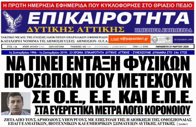 Απόφασεις – Προτάσεις της Ομοσπονδίας Επαγγελματιών, Βιοτεχνών και Εμπόρων Δυτικής Αττικής και του Εμπορικού Συλλόγου Ελευσίνας για την αντιμετώπιση των συνεπειών του αυστηρού τοπικού περιορισμού στους Δήμους της Δυτικής Αττικής, μετά από έκτακτο ΔΣ με τηλεδιάσκεψη στις 26/12/20. Μετά τη σημερινή επίσημη ενημέρωση στους φορείς της Δυτικής Αττικής με πρωτοβουλία του Δημάρχου Ελευσίνας, κ. Οικονόμου,…